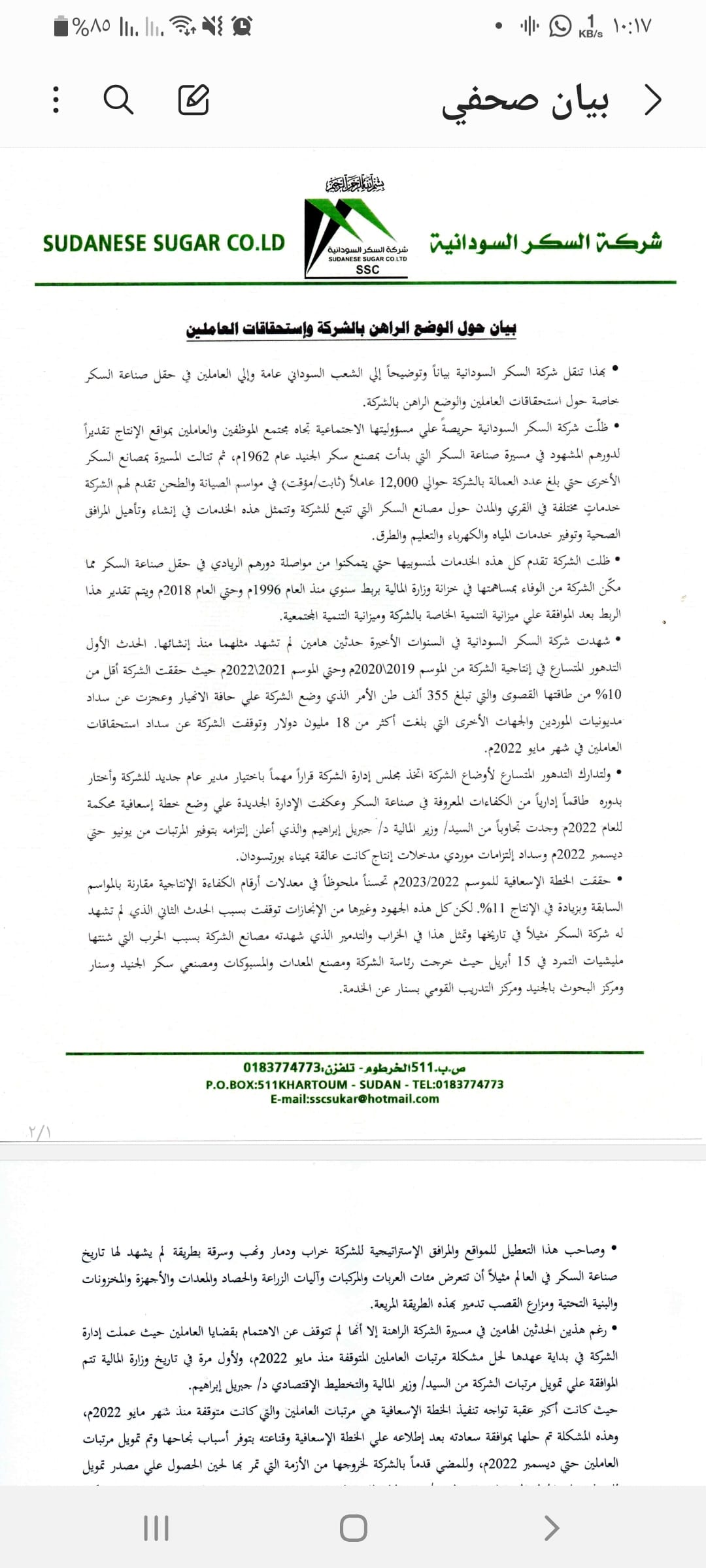 بيان من شركة السكر السودانية حول الوضع الراهن واستحقاقات العاملين