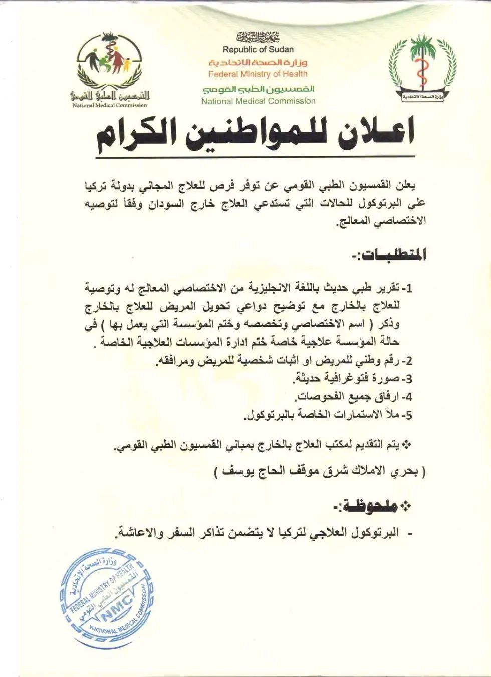 ( بحري الاملاك شرق موقف الحاج يوسف) ملحوظـة:- - البرتوكول العلاجي لتركيا لا يتضمن تذاكر السفر واعاشة