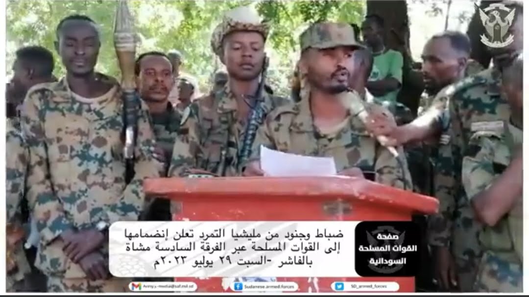 أعلنت قوات تتبع لمليشيا الدعم السريع المتمردة قوامها عدد من الضباط وضباط الصف والجنود بقيادة النقيب أدم داؤود حماد ( البشيري) .. إنسلاخها من المليشيا وإنضمامها إلي صفوف القوات المسلحة .. وأقامت قيادة الفرقة السادسة مشاة بالفاشر التي شهدت إنضمام المجموعة إستقبالا حاشدا للقوات بحضور قادة الفرقة السادسة وقوات حرس الحدود وقوات الترتيبات الأمنية يتقدمهم قائد الفرقة اللواء الركن محمد أحمد الخضر ووسط حشد كبير من منسوبيهم .